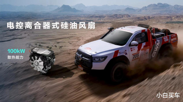 新车还配备博格华纳电控硅油风扇,系统散热能力达100kW,大幅提升发动机散热性能,完美满足极限玩沙、高强度赛事、大角度爬坡等硬核越野需求,同时硅油风扇带来的热血沸腾的轰鸣声,为驾驶者赋予极致情绪价值。